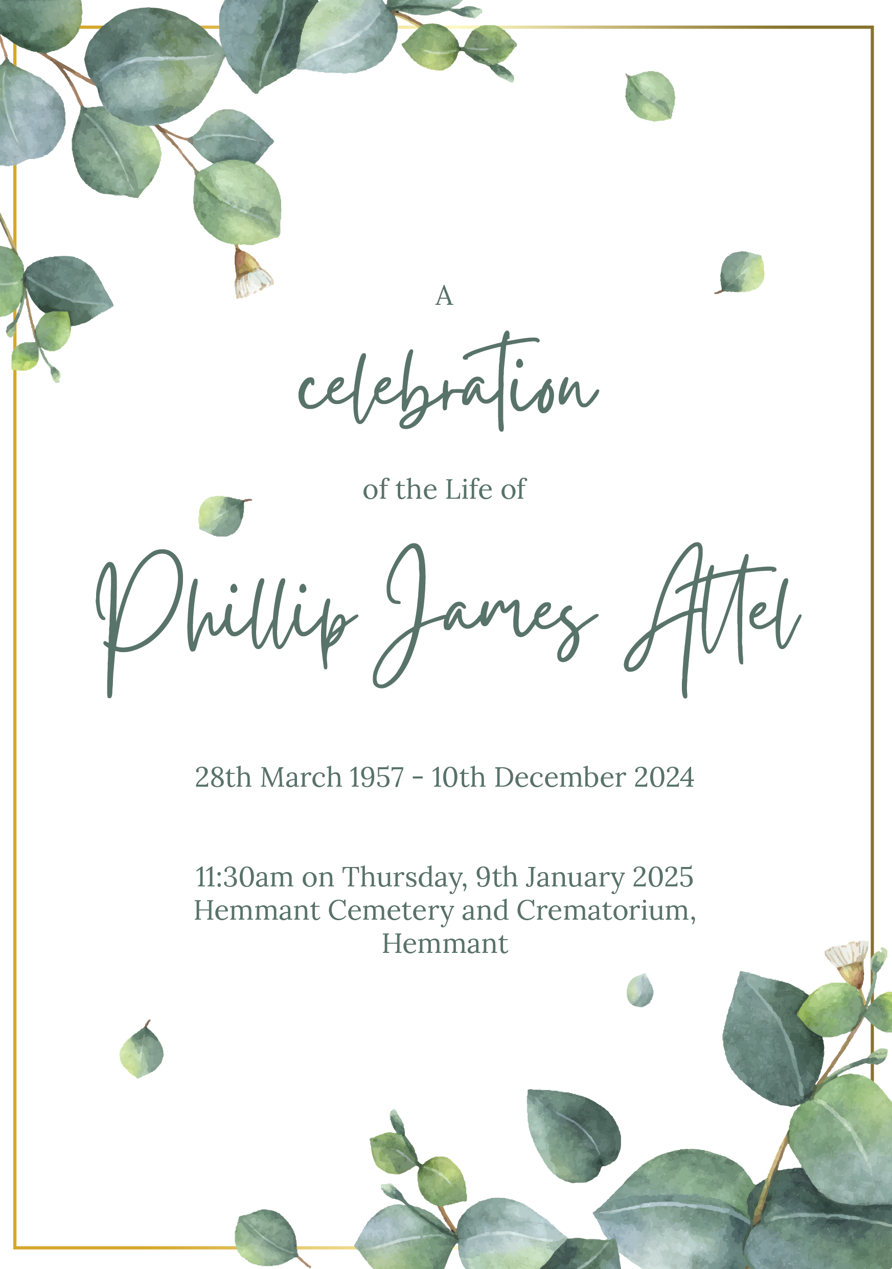 Family and friends are invited to attend a celebration of life for Phillip, to be held on Thursday, 9th January 2025 in the Hemmant Cemetery, 500 Hemmant Tingalpa Road, Hemmant, QLD, commencing at 11:30am.