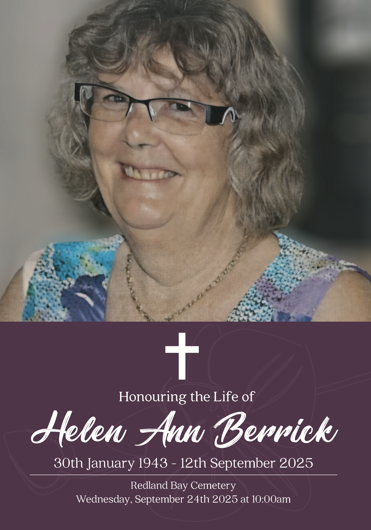 Family and friends are invited to attend a celebration of life for Helen, to be held on Wednesday, 24th September 2025 at the Redland Bay Cemetery, 19-27 Gordon Road, Redland Bay, commencing at 10:00am.