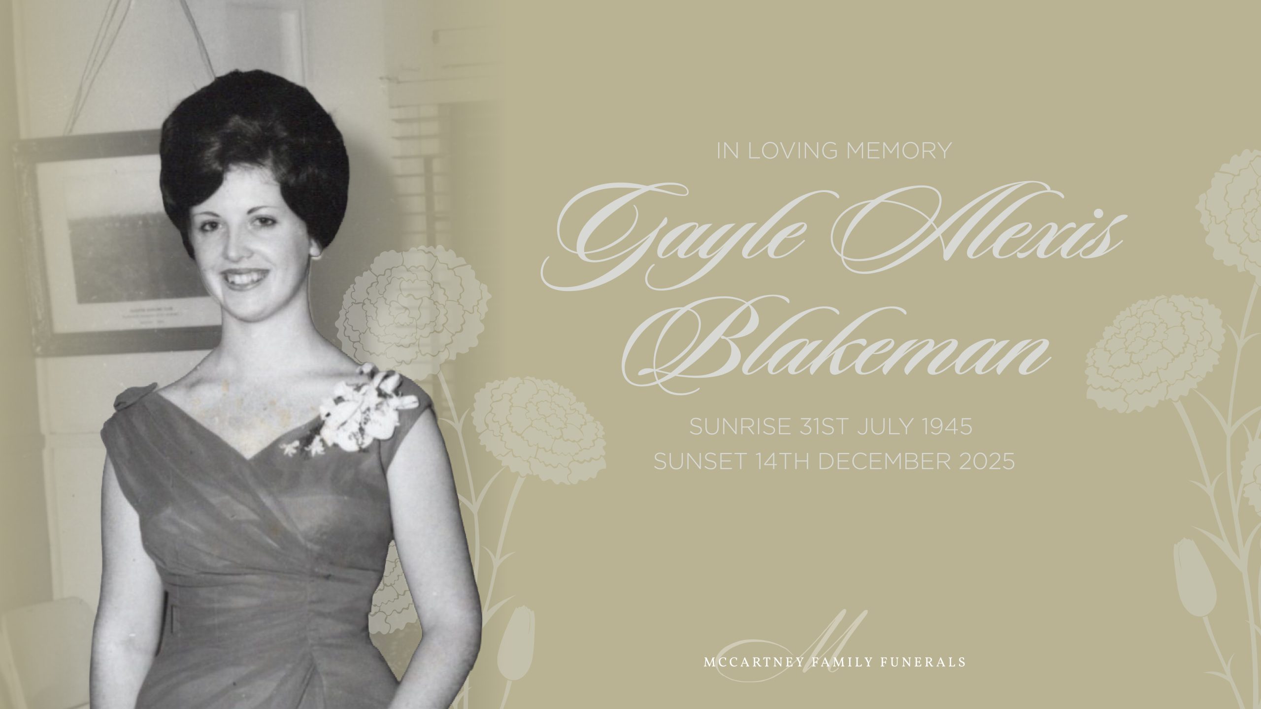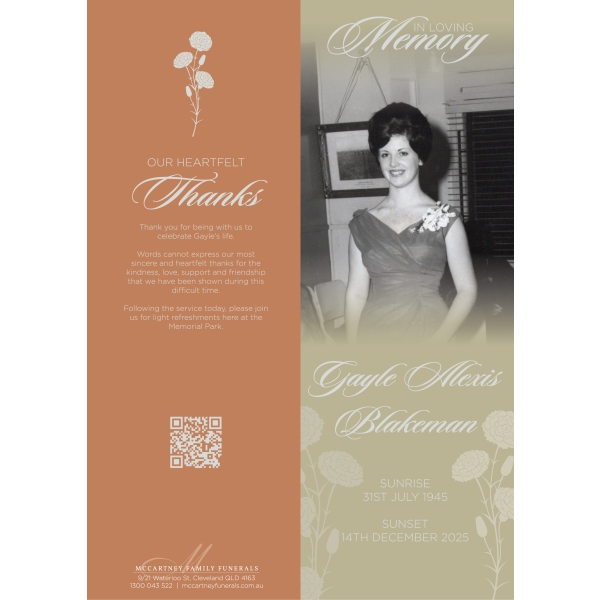 Family and friends are invited to attend a celebration of life for Gayle, to be held on Monday, 22nd December 2025 at the Great Southern Memorial Park, 1774/1794 Mount Cotton Rd, Carbrook, commencing at 2:00pm