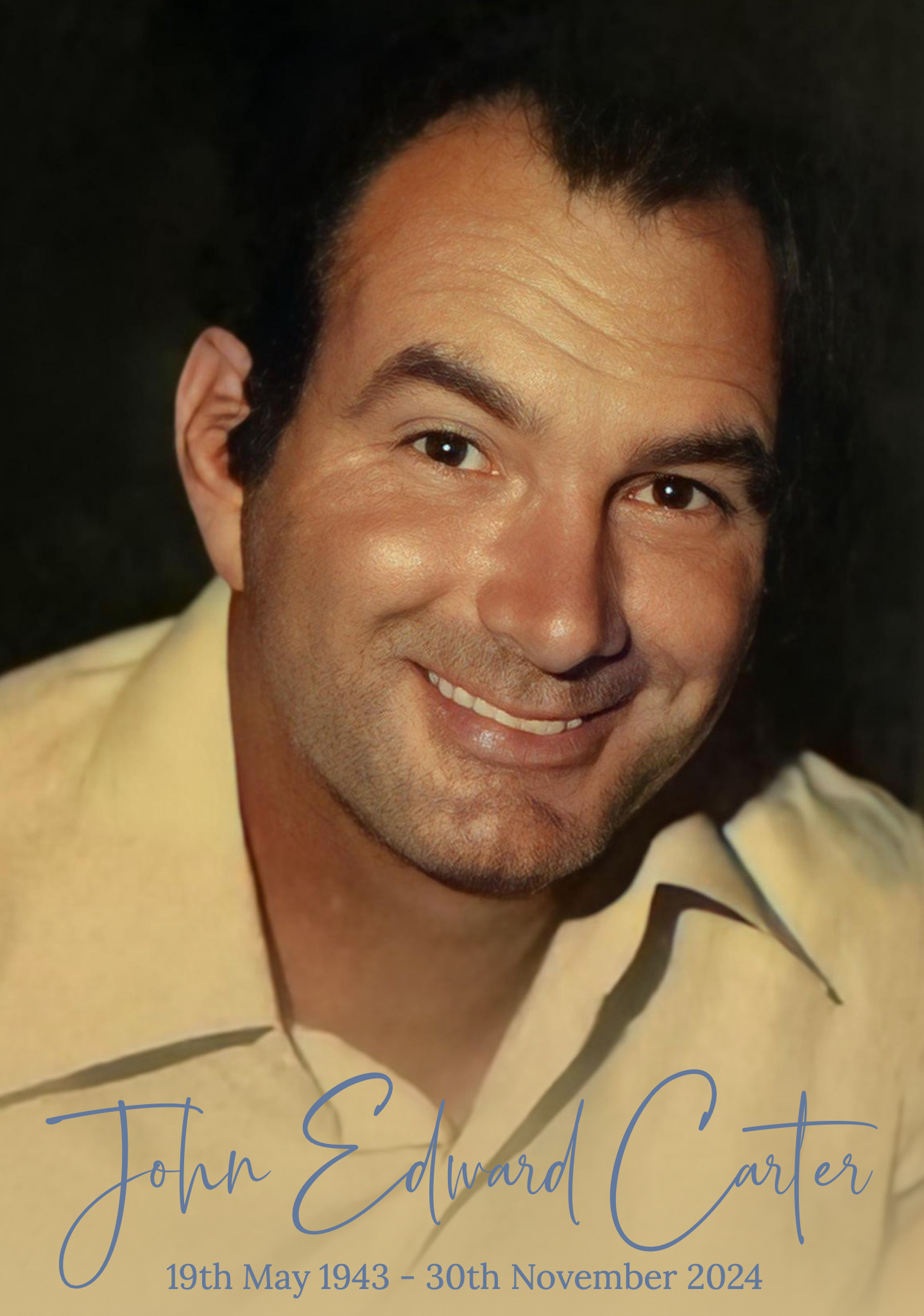 Home CARTER, John Edward CARTER, John Edward Family and friends are invited to attend a celebration of life for John, to be held on Wednesday, 11th December 2024 in the Chapel at the Centenary Memorial Gardens Cemetery and Crematorium, 353 Wacol Station Rd, Sumner, commencing at 2:00pm. Live Streaming View Live Stream Enter Pin: 2612 Service Stationery Please click on the image above to download a copy of the Service Stationery. Photo Reflection Service Recording Your Funeral Director for this service was + Add to Google Calendar + iCal / Outlook export Date 11 12 24 Expired! Time 2:00 pm Labels Funeral Service Location Centenary Memorial Gardens 353 Wacol Station Road, Sumner, QLD, 4074 Website https://cmgcc.com.au/chapels-facilities Share this event
