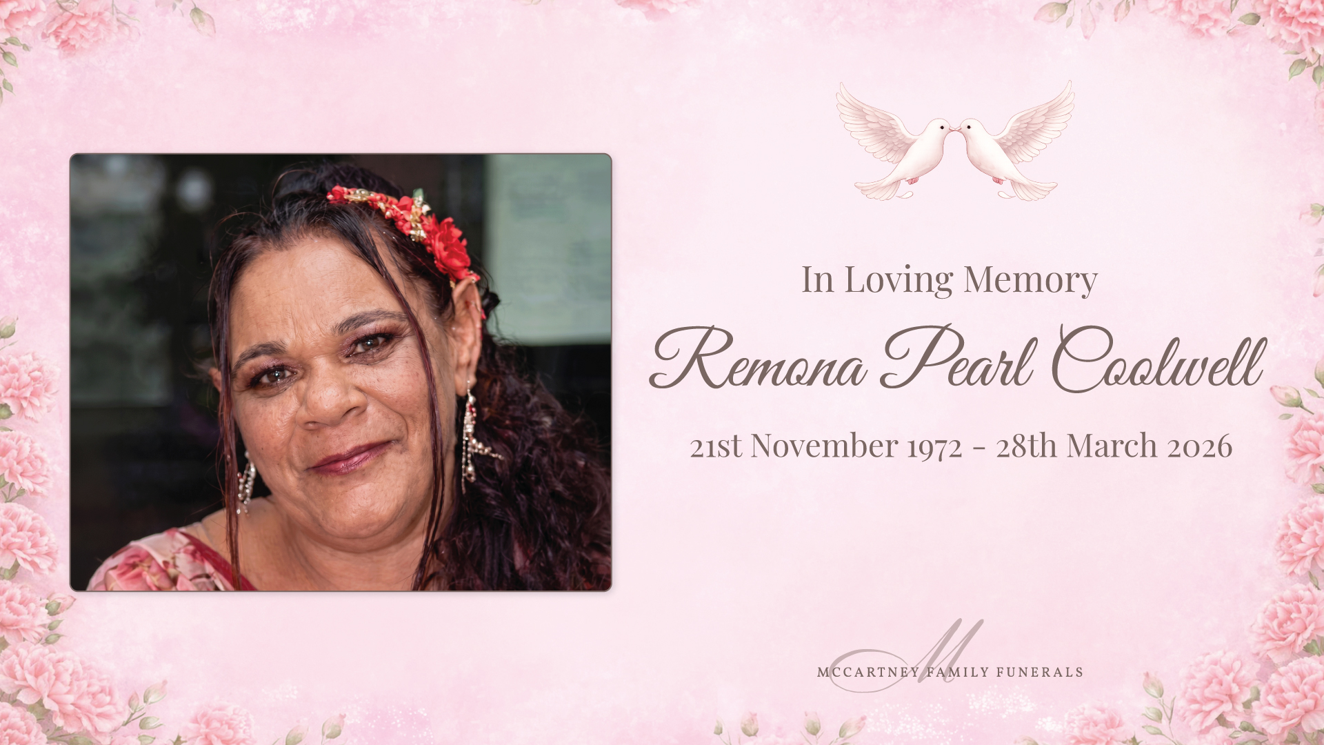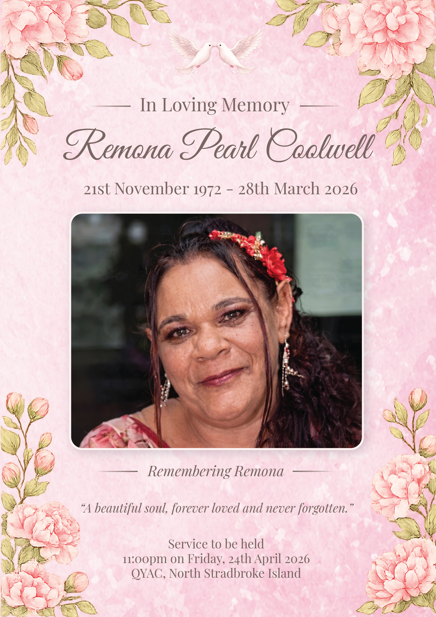 Home COOLWELL, Remona Pearl COOLWELL, Remona Pearl Family and friends are invited to attend a celebration of life for Remona, to be held on Friday, 24th April 2026 at Quandamooka Yoolooburrabee AboriginalCorporation, 100 E Coast Rd, Dunwich, QLD, 4183, commencing at 11:00am. Live Streaming View Live Stream Live Stream commences at 10:55am QLD time. Service Stationery Please click on the image above to download a copy of the Service Stationery. Your Funeral Director for this service was + Add to Google Calendar + iCal / Outlook export Date 24 04 26 Time 11:00 am Labels Funeral Service Location Quandamooka Yoolooburrabee Aboriginal Corporation 100 East Coast Road, Dunwich QLD 4183 Website https://qyac.net.au/ Share this event