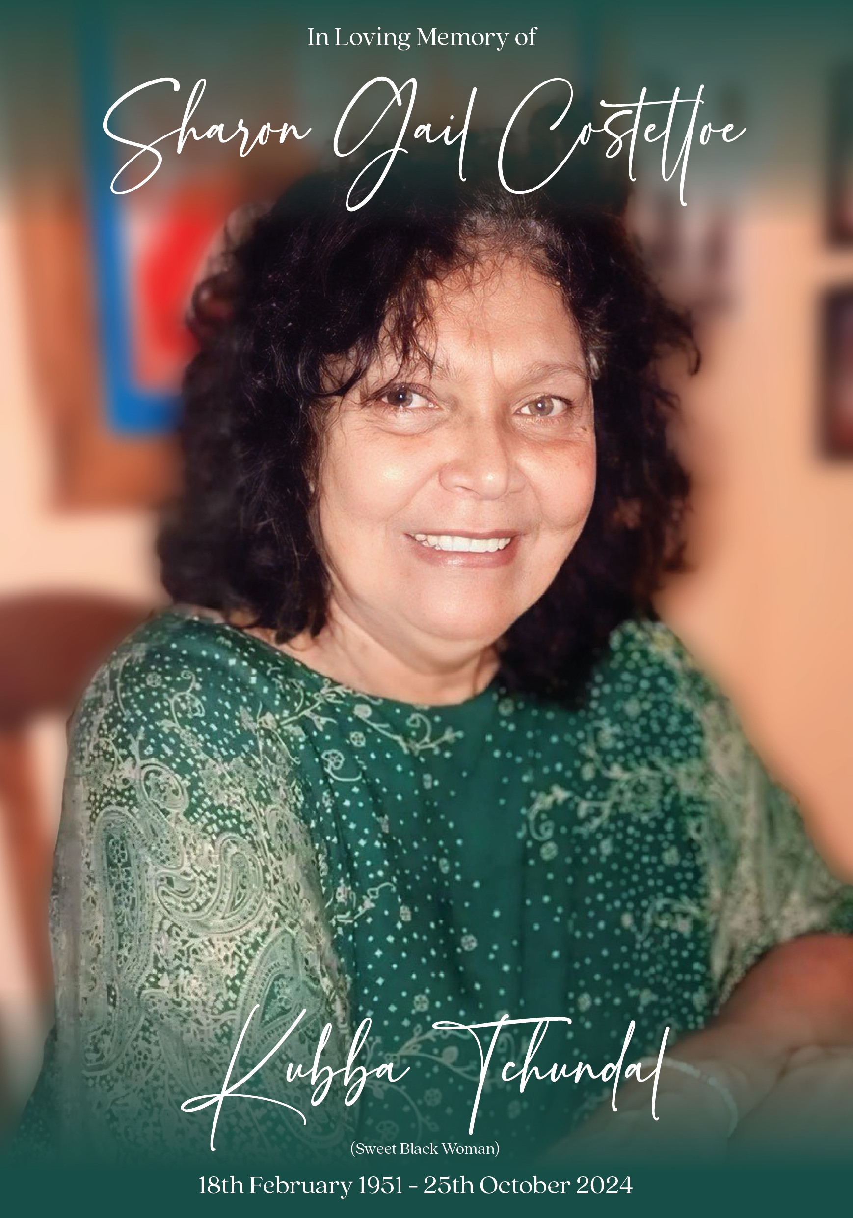 Family and friends are invited to attend a celebration of life for Sharon, to be held on Thursday 7th November 2024 in the Dunwich Public Hall, 6 Ballow Road, Dunwich, QLD, commencing at 11:00am.