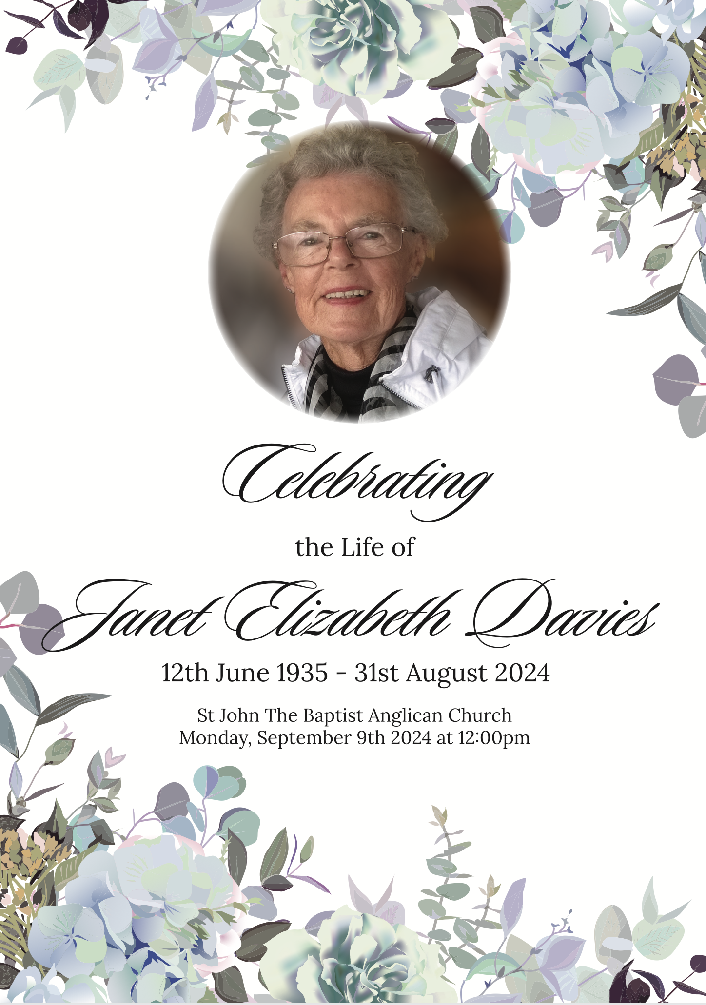 Family and friends are invited to attend a celebration of life for Janet, to be held on Monday 9th September 2024 at the St John The Baptist Anglican Church, 177 Oxford St, Bulimba, commencing at 12:00pm.