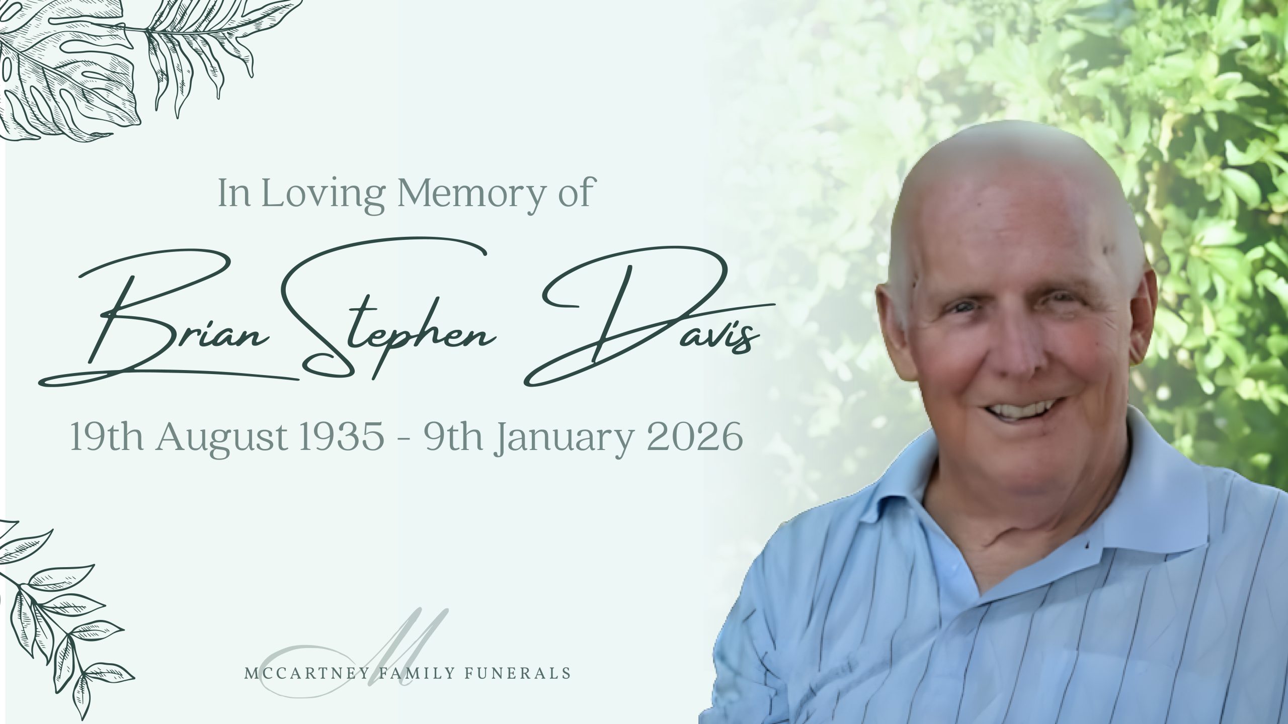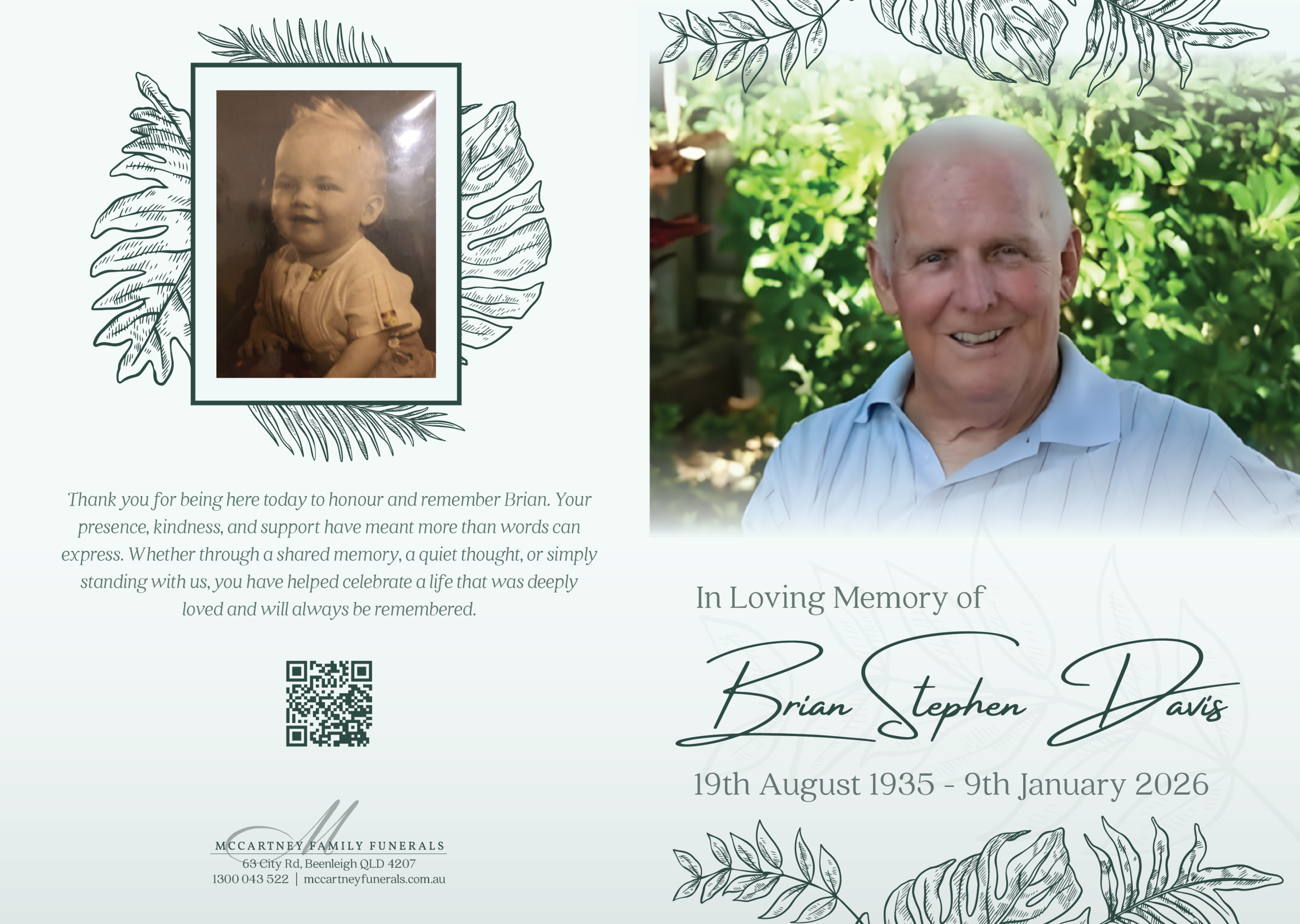 Home DAVIS, Brian Stephen DAVIS, Brian Stephen Family and friends are invited to attend a celebration of life for Brian, to be held on Monday, 19th January 2026 in the chapel at the Mt Gravatt Cemetery and Crematorium, 620 Mains Rd, Nathan QLD 4111, commencing at 11:00am. Live Streaming View Live Stream Live Stream commences at 10:55am QLD timeAccess Pin: 7749 Photo Reflection Service Stationery Please click on the image above to download a copy of the Service Stationery. Your Funeral Director for this service was + Add to Google Calendar + iCal / Outlook export Date 19 01 26 Expired! Time 11:00 am Labels Funeral Service Location Mount Gravatt Cemetery and Crematorium 620 Mains Road, Macgregor QLD 4109 Share this event