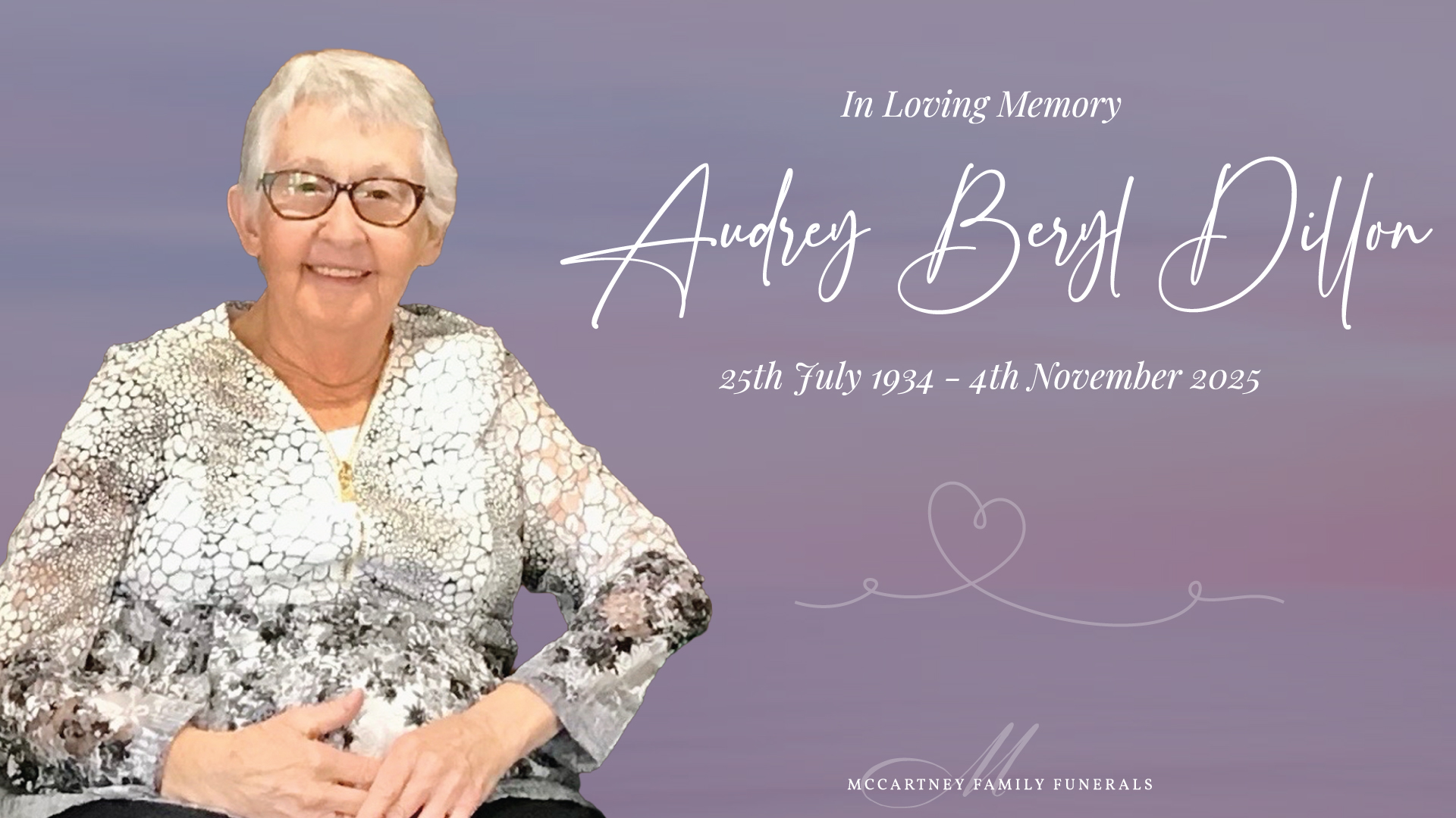 Home DILLON, Audrey Beryl DILLON, Audrey Beryl Family and friends are invited to attend a celebration of life for Audrey, to be held on Thursday, 13th November 2025 in the Garden Chapel at the Great Southern Memorial Park, 1774/1794 Mount Cotton Rd, Carbrook, commencing at 11:00am. Live Streaming View Live Stream Live Stream commences at 10:55am QLD time Service Stationery Please click on the image above to download a copy of the Service Stationery. Photo Reflection Your Funeral Director for this service was + Add to Google Calendar + iCal / Outlook export Date 13 11 25 Time 11:00 am Labels Funeral Service Location Garden Chapel - Great Southern Memorial Park 1774-1794 Mount Cotton Road Carbrook QLD 4130 Share this event