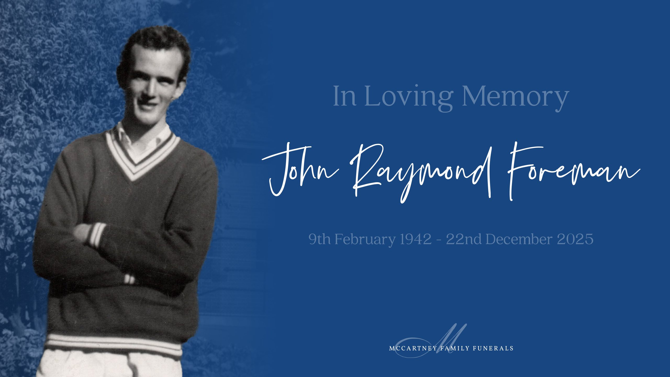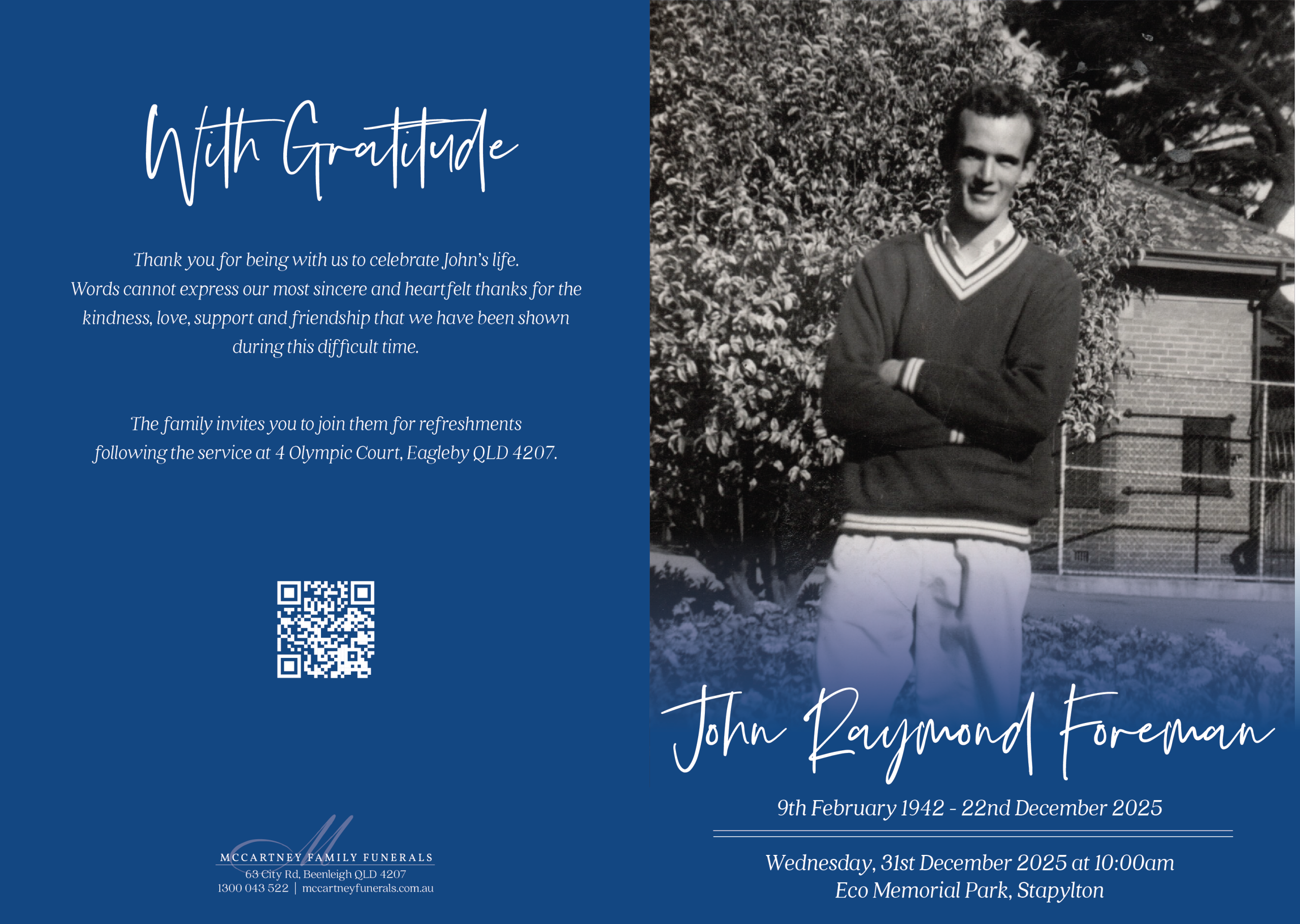 Home FOREMAN, John Raymond FOREMAN, John Raymond Family and friends are invited to attend a celebration of life for John, to be held on Wednesday, 31st December 2025 at the Eco Memorial Park & Crematorium, 21 Quinns Hill Rd W, Stapylton QLD 4207, commencing at 10:00am. Live Streaming View Live Stream Live Stream commences at 9:55am QLD time Service Stationery Please click on the image above to download a copy of the Service Stationery. Photo Reflection Your Funeral Director for this service was + Add to Google Calendar + iCal / Outlook export Date 31 12 25 Expired! Time 10:00 am Labels Funeral Service Location ECO Memorial Park 21 Quinns Hill Road, West Stapylton, QLD, 4207 Website https://www.ecomemorialpark.com.au/ Share this event
