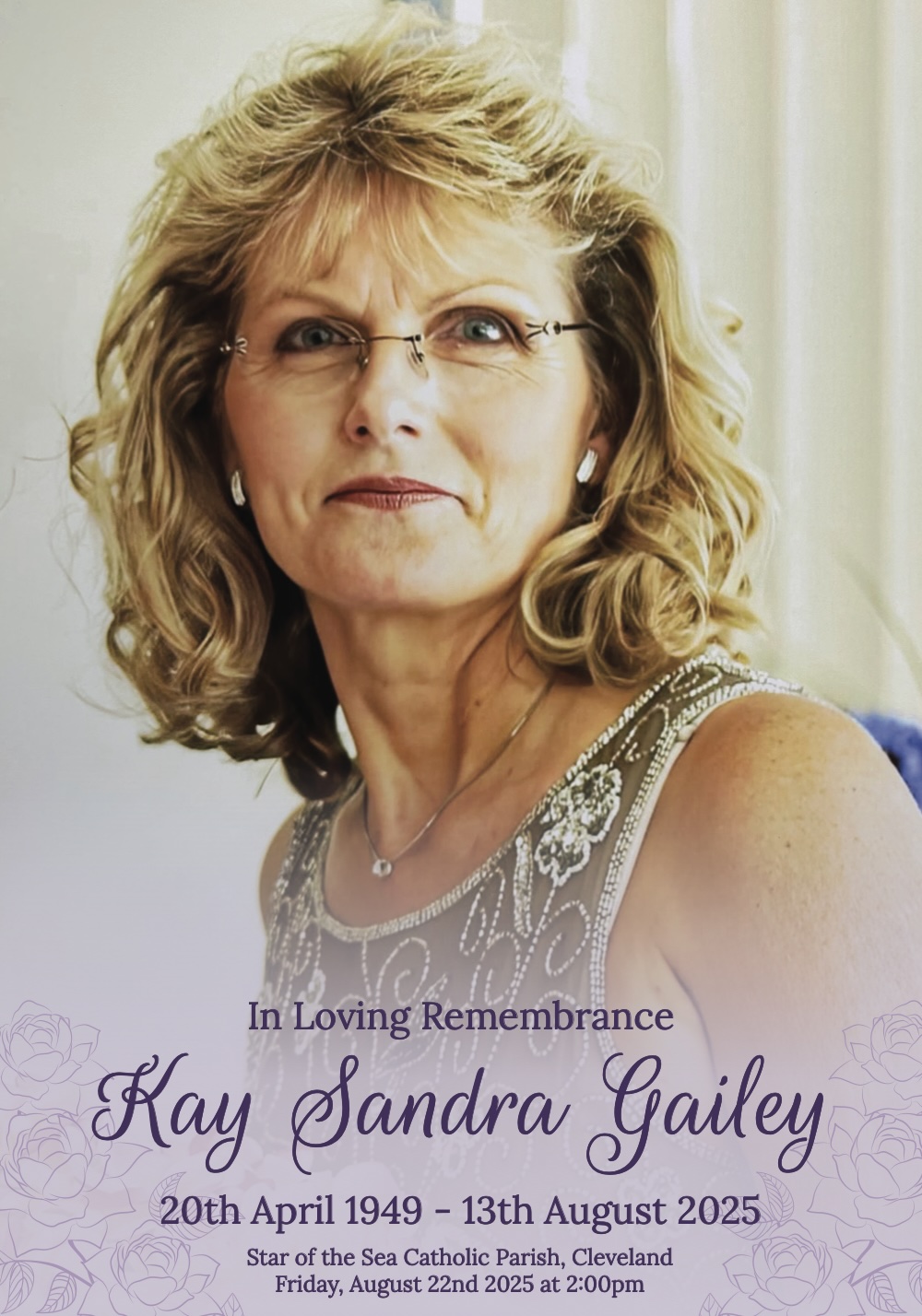 Family and friends are invited to attend a celebration of life for Kay, to be held on Friday, 22nd August 2025 at the Star of the Sea Catholic Parish, 53 Passage, Street, Cleveland, commencing at 2:00pm.