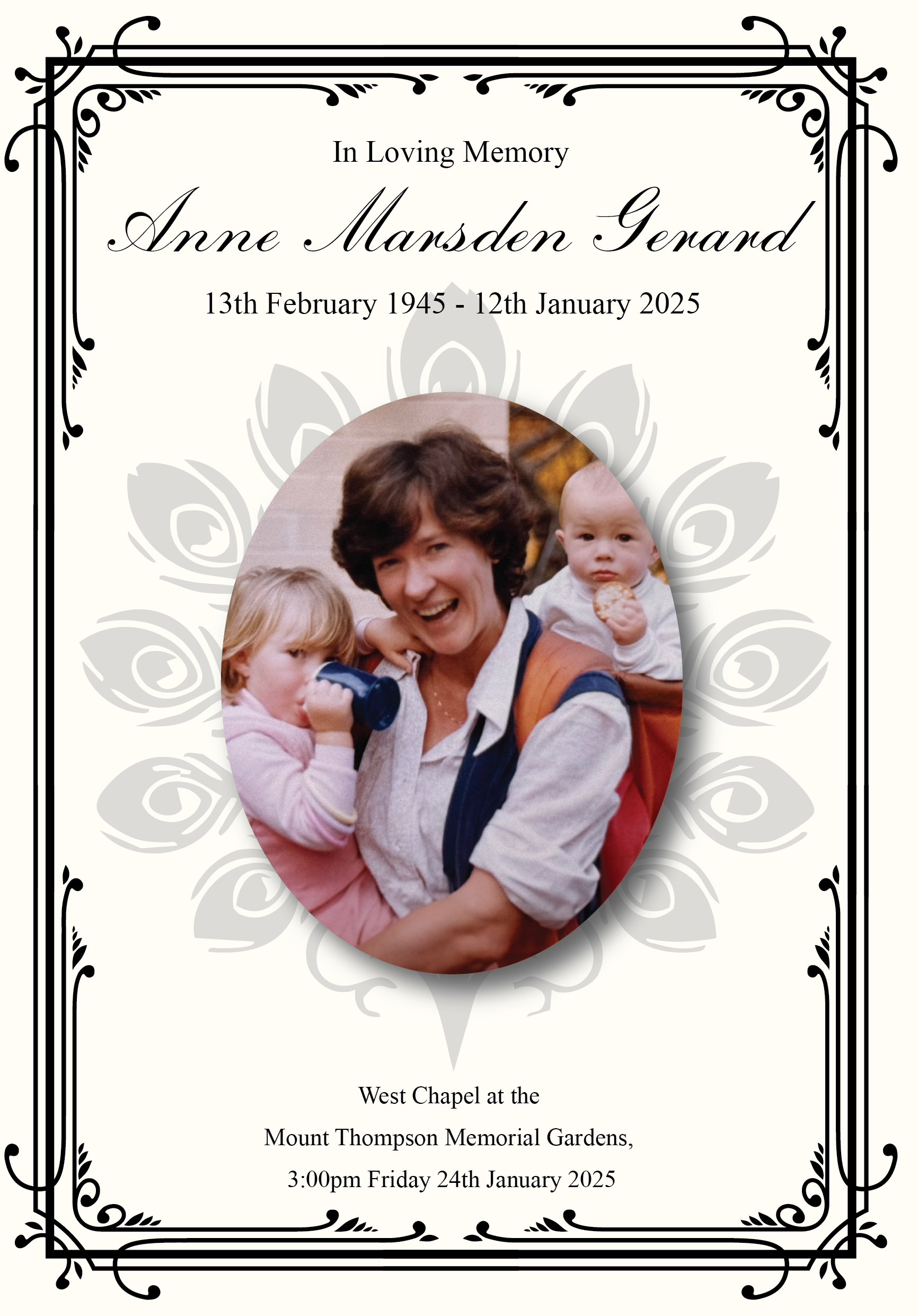 Family and friends are invited to attend a celebration of life for Anne, to be held on Friday 24th January 2025 in the West Chapel at the Mt Thompson Memorial Gardens and Crematorium, 329 Nursery Rd, Holland Park, commencing at 3:00pm.