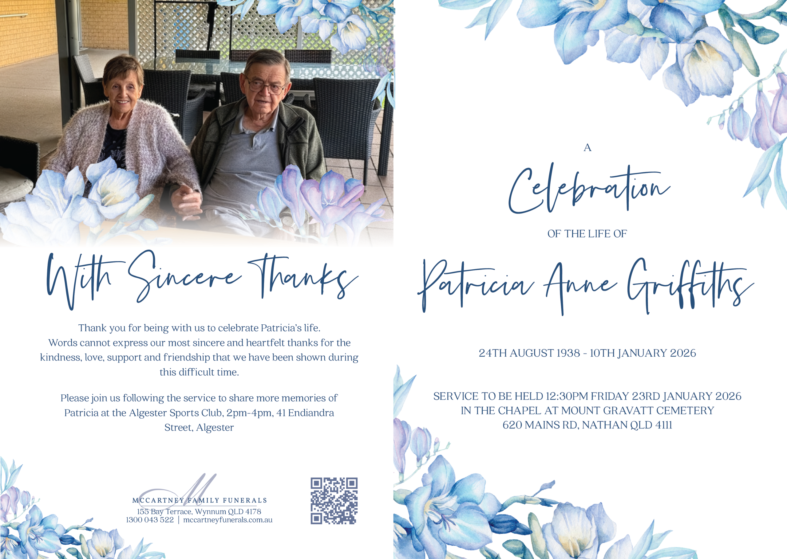 Family and friends are invited to attend a celebration of life for Patricia, to be held on Friday, 23rd January 2026 in the chapel at the Mt Gravatt Cemetery and Crematorium, 620 Mains Rd, Nathan QLD 4111, commencing at 12:30pm.
