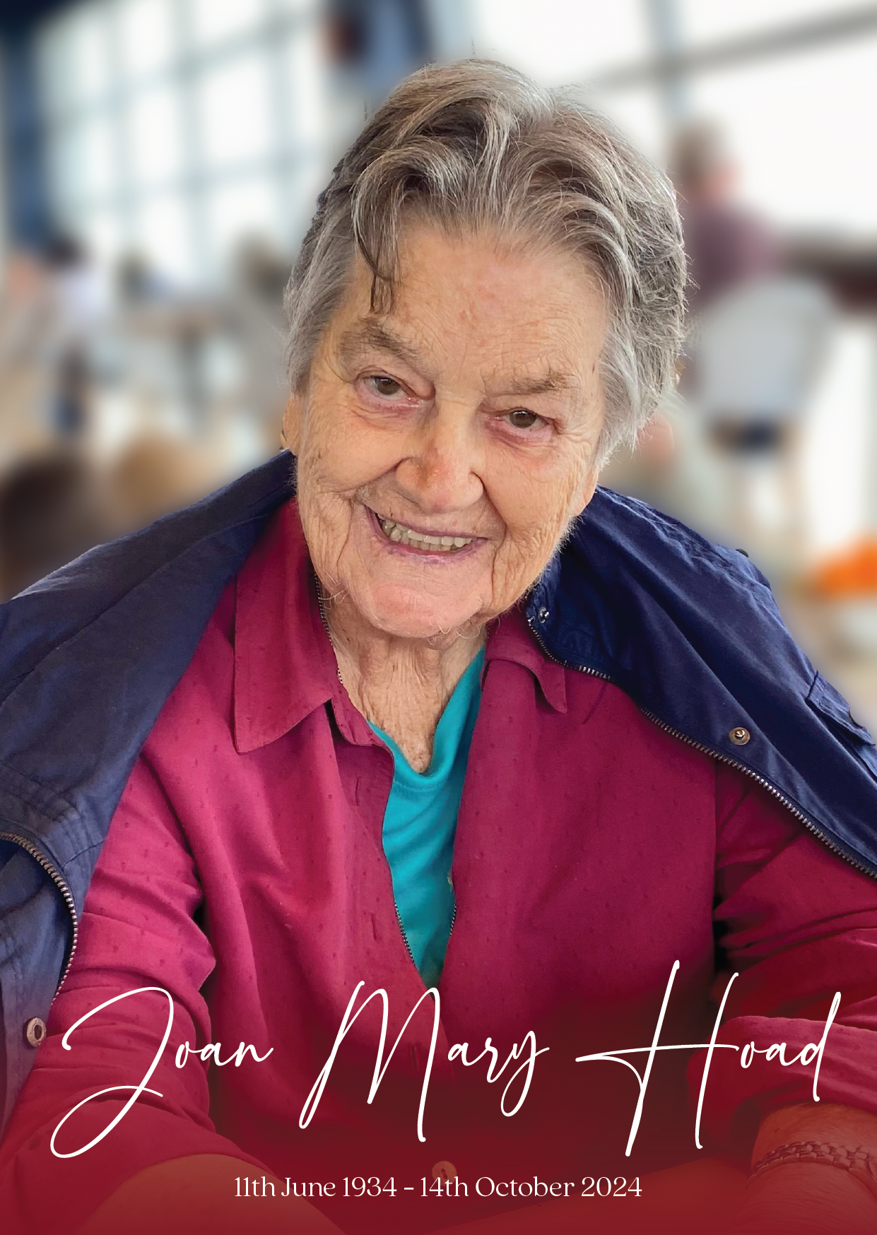 Family and friends are invited to attend a celebration of life for Joan, to be held on Wednesday 30th October 2024 in the Great Southern Memorial Park, 1774-1970 Mount Cotton Road, Carbrook, Qld commencing at 11:00am.