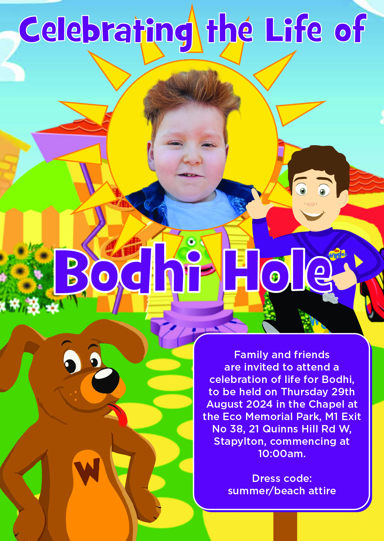 Family and friends are invited to attend a celebration of life for Bodhi, to be held on Thursday 29th August 2024 in the Chapel at the Eco Memorial Park, M1 Exit No 38, 21 Quinns Hill Rd W, Stapylton, commencing at 10:00am.