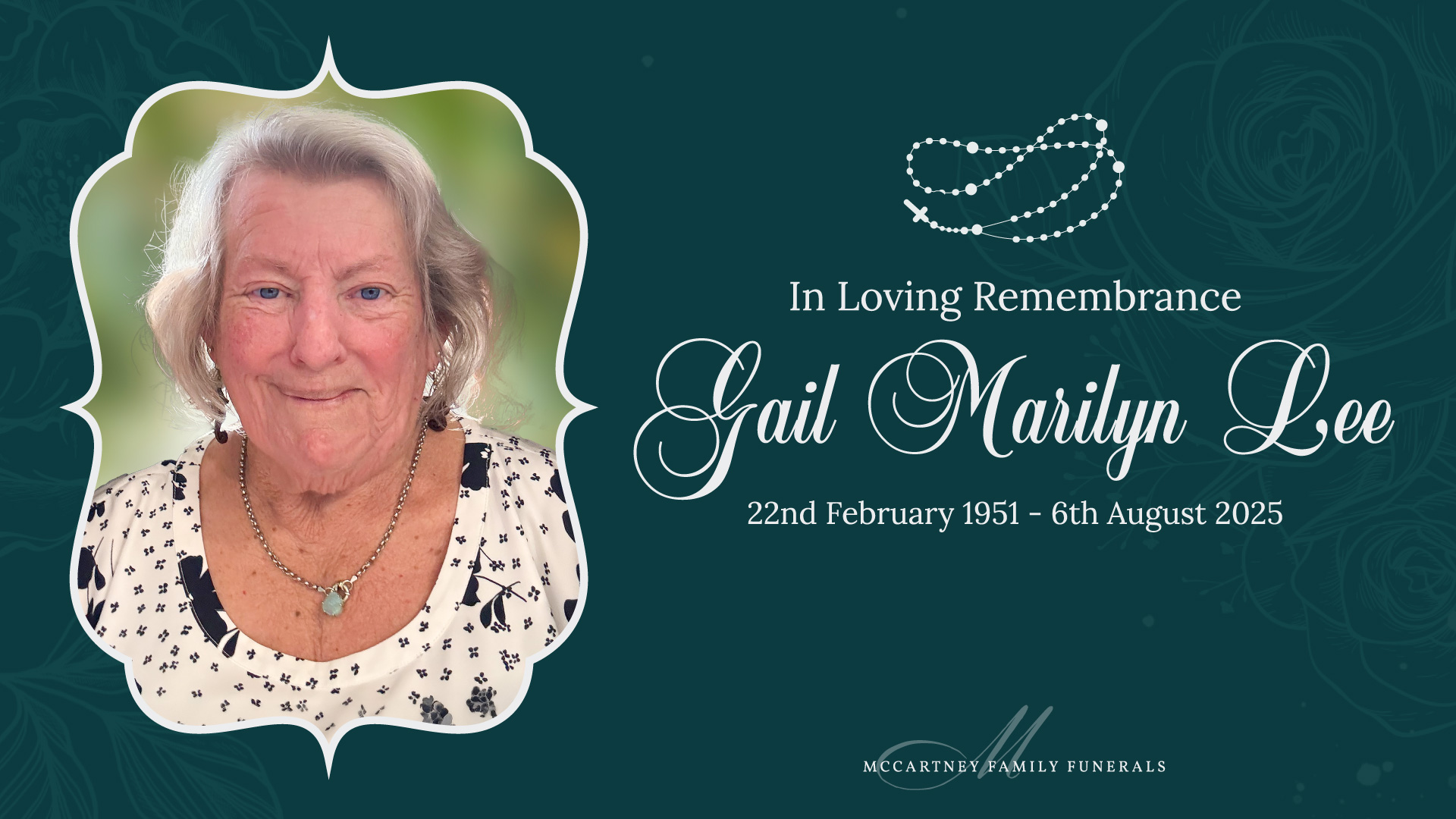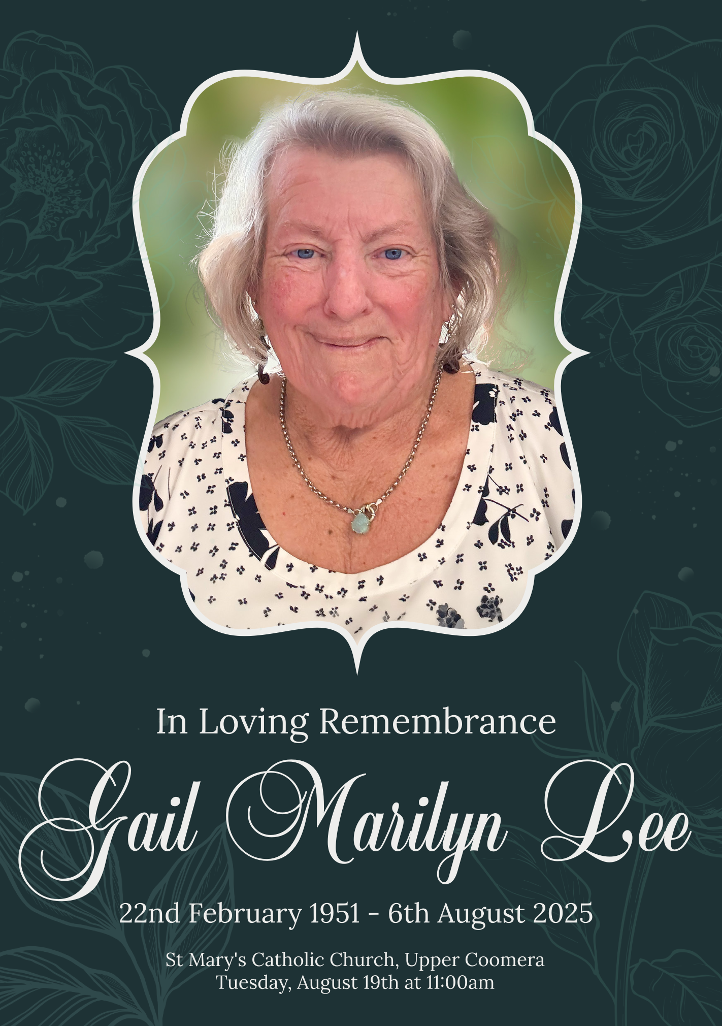 Family and friends are invited to attend a celebration of life for Gail, to be held on Tuesday, 19th August 2025 at the St Mary’s Catholic Church, 185 Billinghurst Crescent, Upper Coomera, commencing at 11:00am.