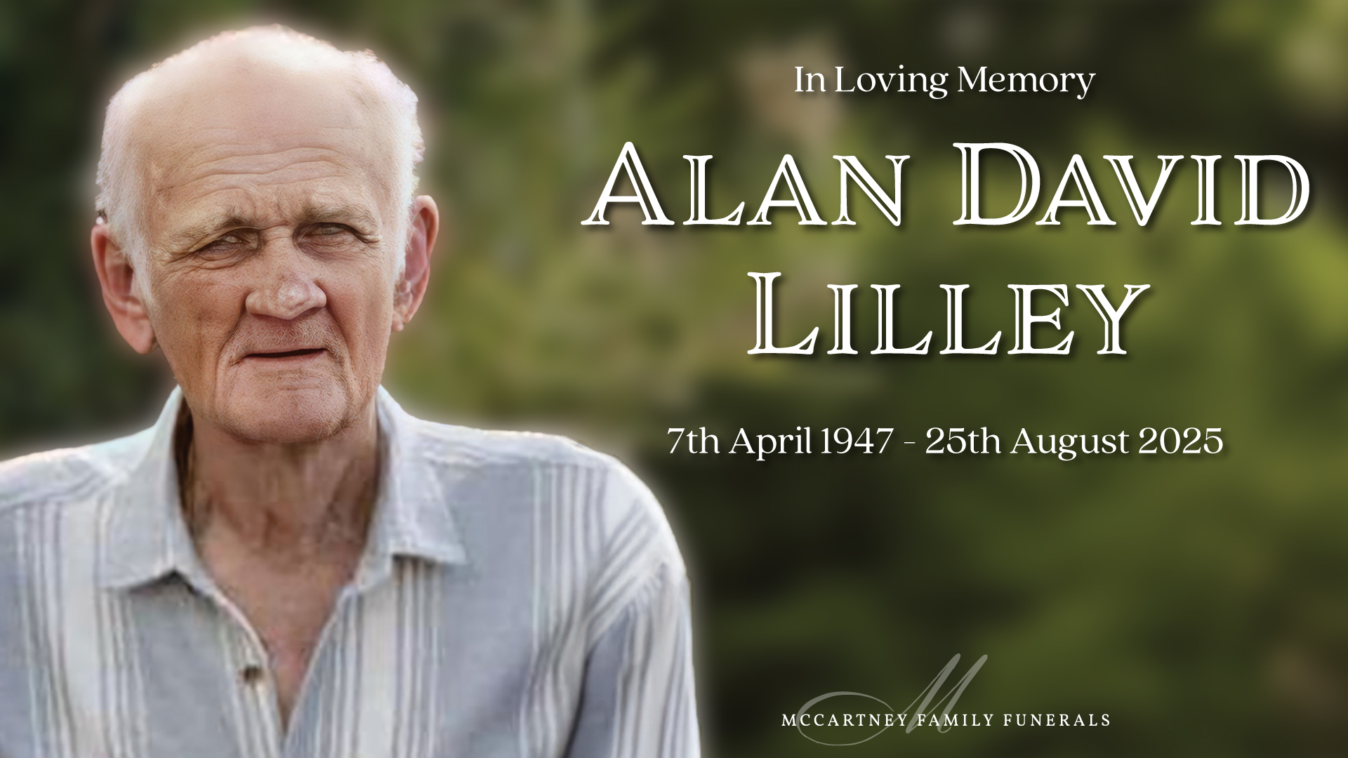 Home LILLEY, Alan David LILLEY, Alan David Family and friends are invited to attend a celebration of life for Alan, to be held on Friday, 5th September 2025 in the Chapel at the Eco Memorial Park, 21 Quinns St, Stapylton, commencing at 12:00pm. Photo Reflection Service Recording Your Funeral Director for this service was + Add to Google Calendar + iCal / Outlook export Date 05 09 25 Expired! Time 12:00 pm Labels Funeral Service Location ECO Memorial Park 21 Quinns Hill Road, West Stapylton, QLD, 4207 Website https://www.ecomemorialpark.com.au/ Share this event