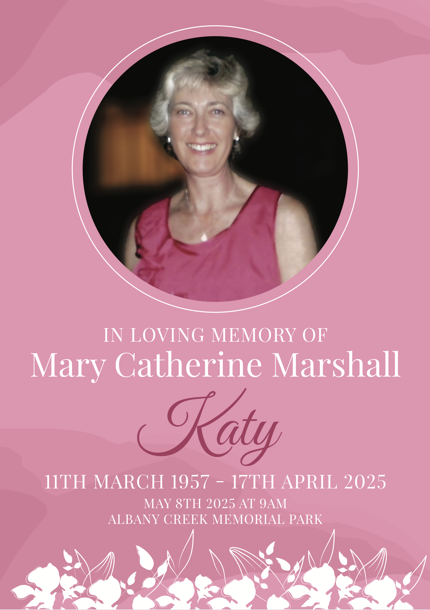 Home MARSHALL, Mary Catherine “Katy” MARSHALL, Mary Catherine “Katy” Family and friends are invited to attend a celebration of life for Mary (Katy), to be held on Thursday, 8th May 2025 in the Garden Chapel at the Albany Creek Memorial Park, 400 Albany Creek Rd, Bridgeman Downs, commencing at 9:00am. Live Streaming View Live Stream Live Stream commences at 8:50am QLD time Service Stationery Please click on the image above to download a copy of the Service Stationery. Photo Reflection Service Recording Your Funeral Director for this service was + Add to Google Calendar + iCal / Outlook export Date 08 05 25 Expired! Time 9:00 am Labels Funeral Service Location Garden Chapel - Albany Creek Memorial Park 400 Albany Creek Road, Bridgeman Downs, QLD, 4035 Share this event