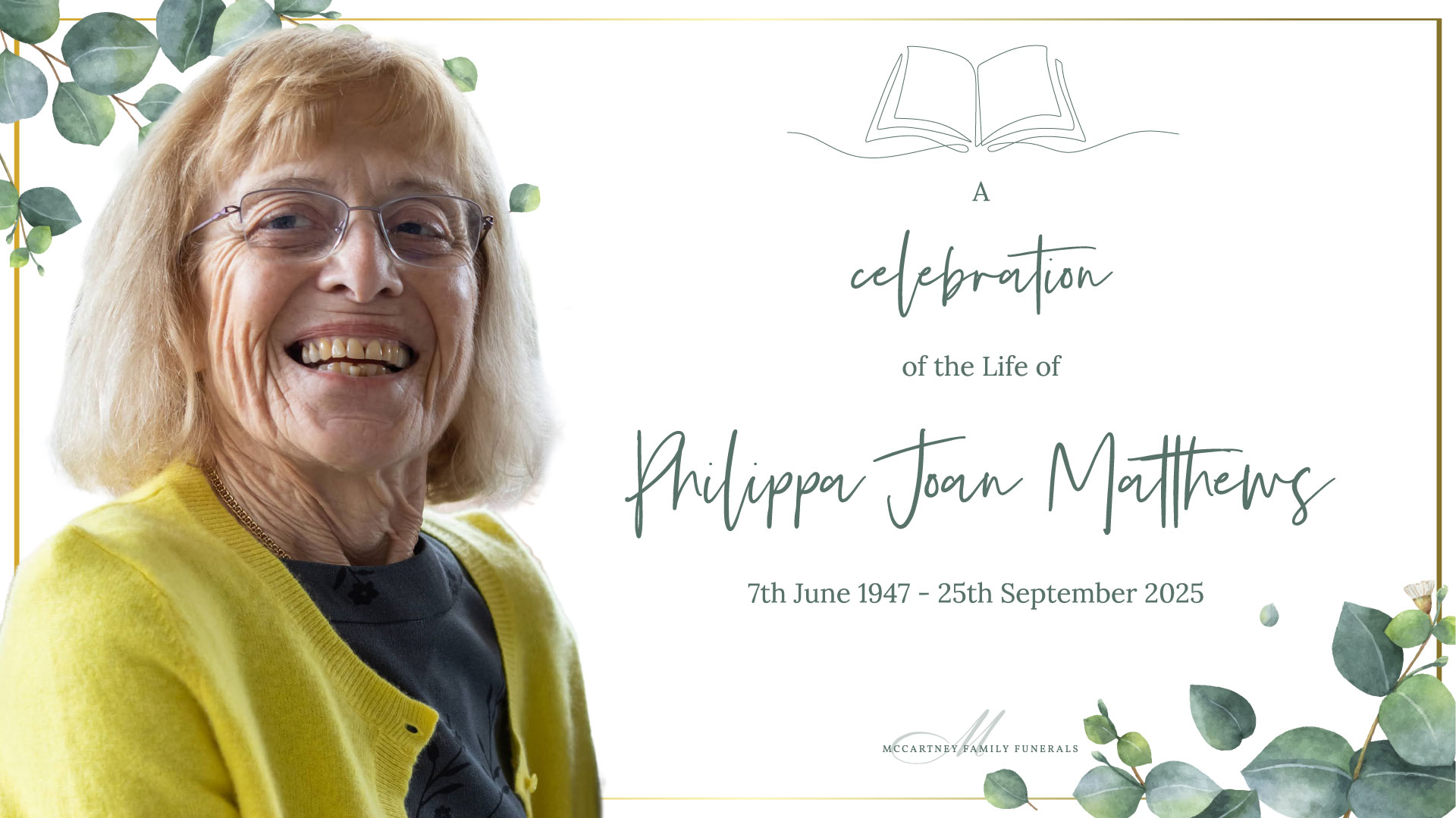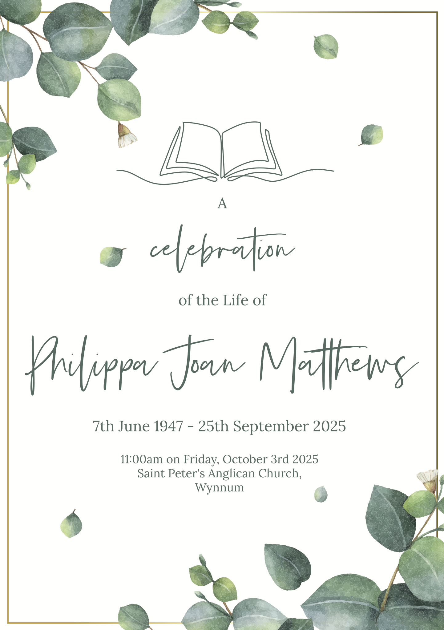 Family and friends are invited to attend a celebration of life for Philippa, to be held Friday, 3rd October 2025 at the Saint Peter’s Anglican Church, 77 Charlotte St, Wynnum commencing at 11:00am.