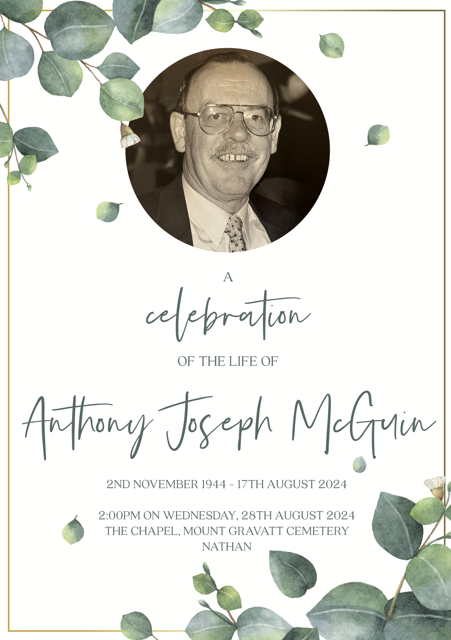Family and friends are invited to attend a celebration of life for Anthony, to be held on Wednesday 28th August 2024 in the Chapel at the Mount Gravatt Cemetery and Crematorium, 620 Mains Rd, Nathan, commencing at 2:00pm.