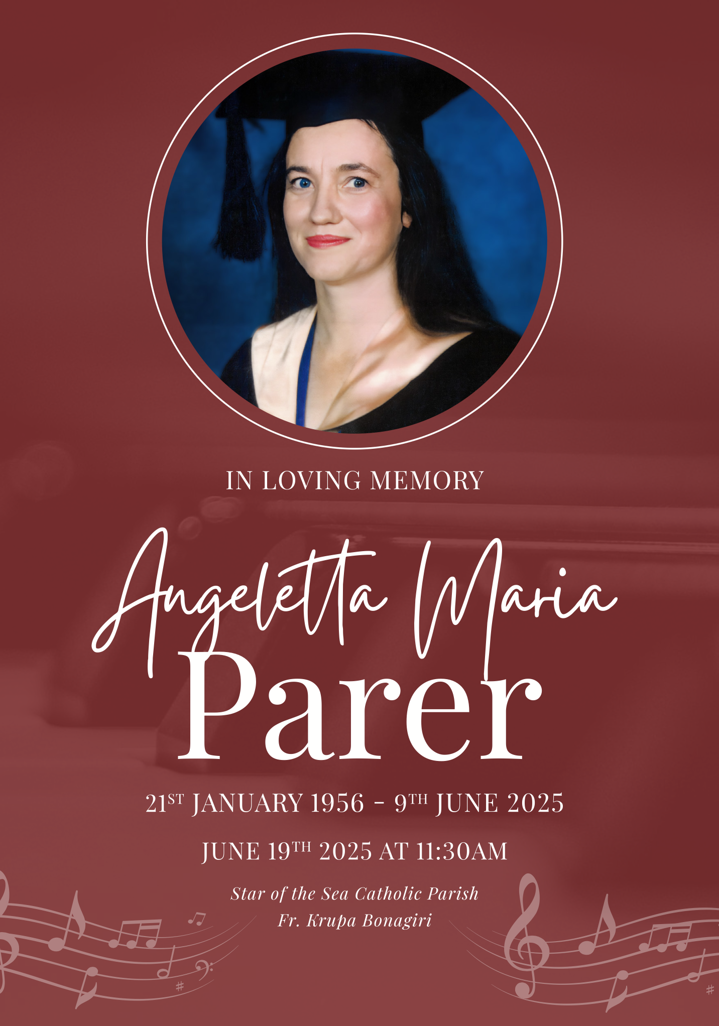 Family and friends are invited to attend a celebration of life for Angeletta, to be held on Thursday, 19th June 2025 at the Star of the Sea Catholic Parish, 53 Passage St, Cleveland, commencing at 11:30am.