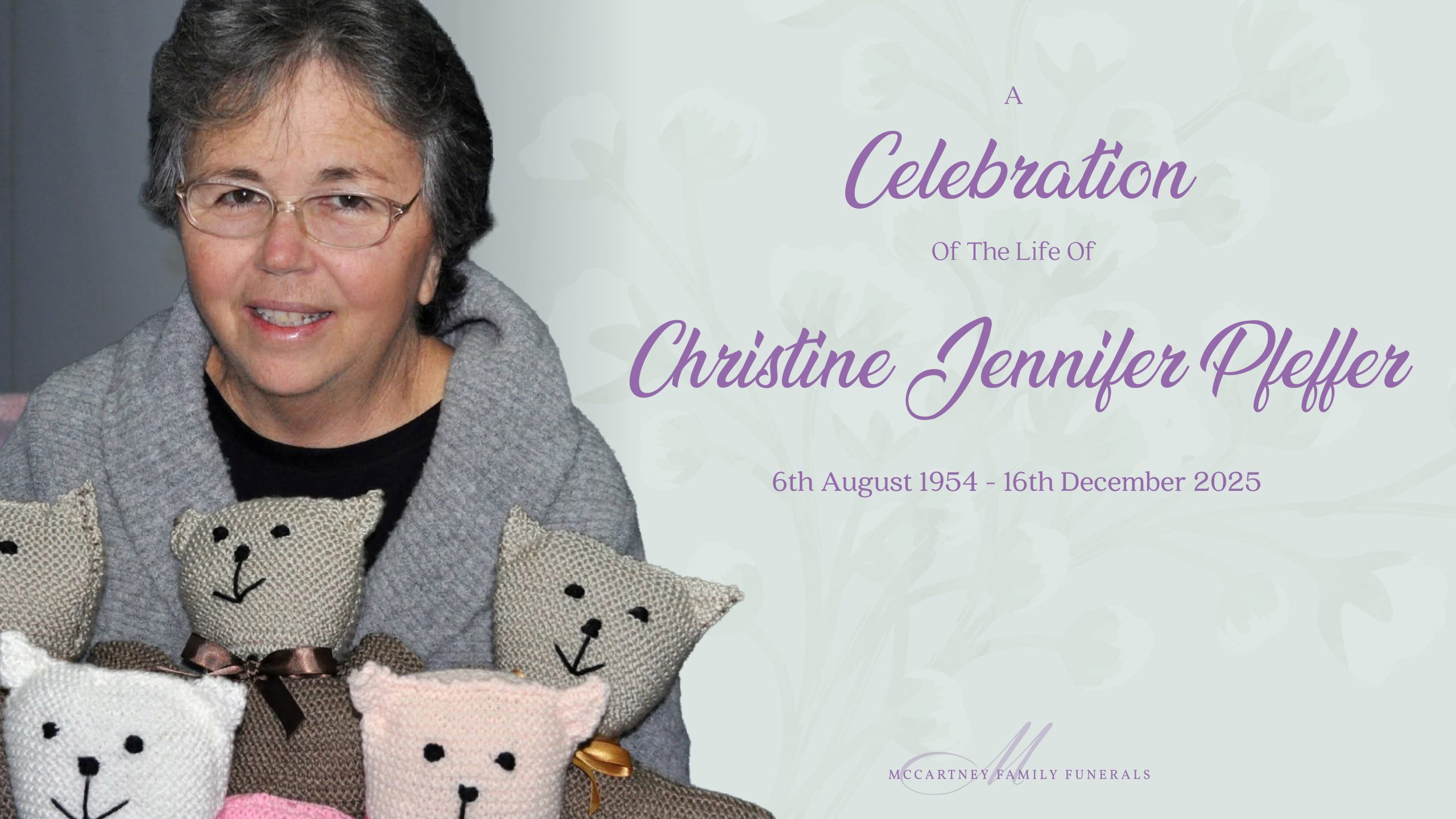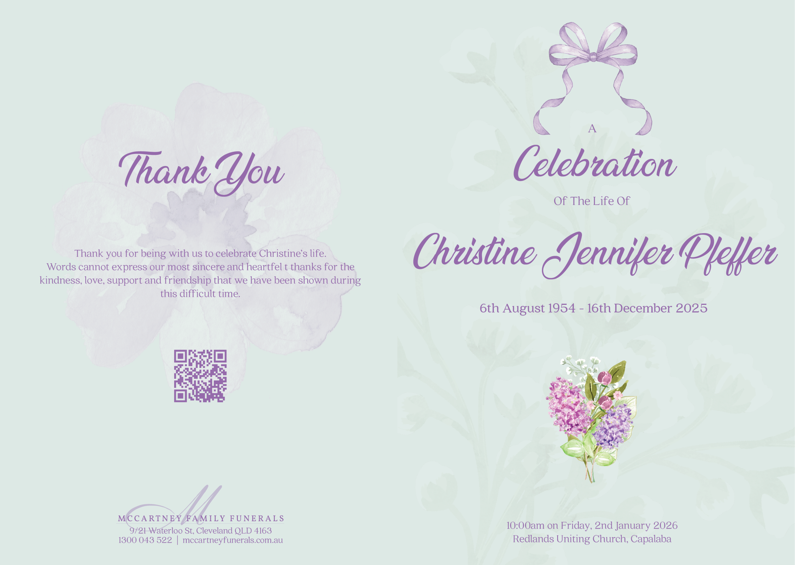 Family and friends are invited to attend a celebration of life for Christine, to be held on Friday, 2nd January 2026 at the Redlands Uniting Church, 32 Ney Rd, Capalaba QLD 4157, commencing at 10:00am.