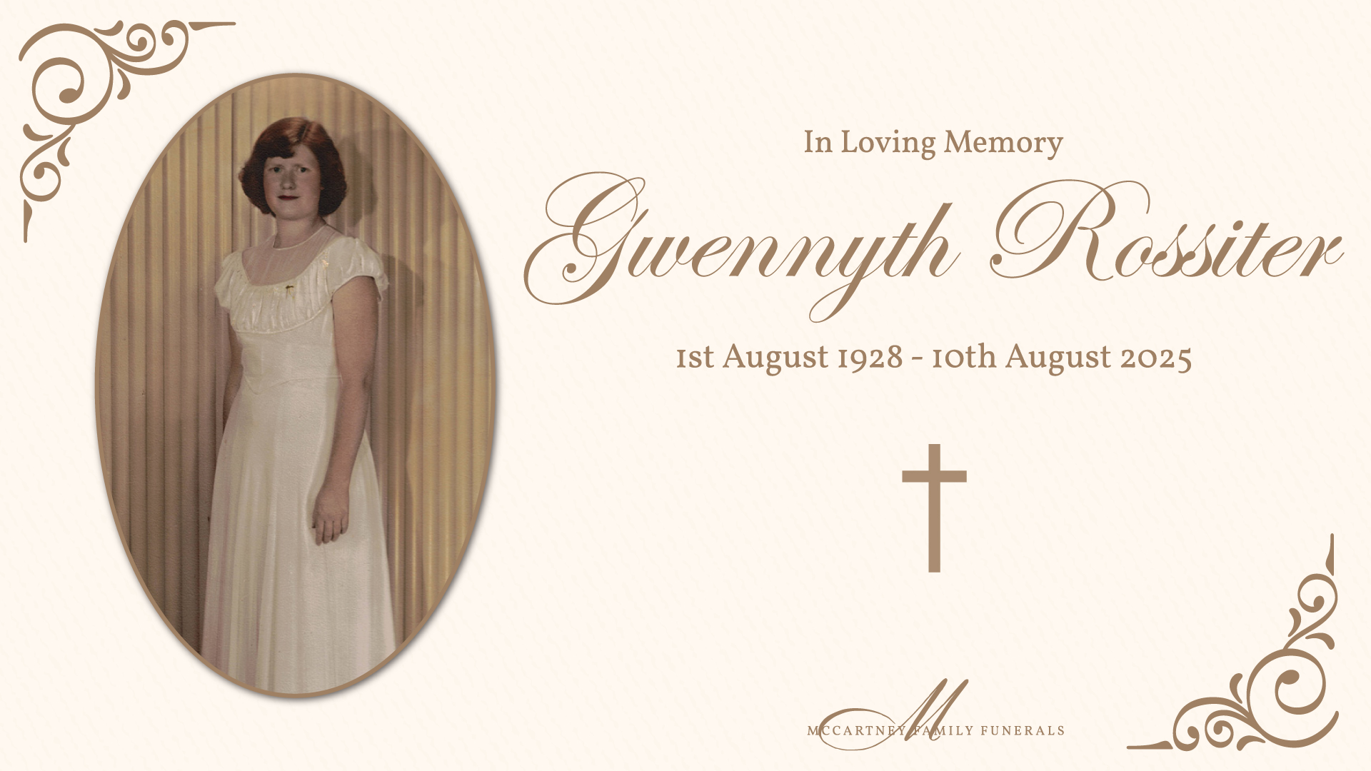 Family and friends are invited to attend a celebration of life for Gwennyth, to be held on Wednesday, 20th August 2025 at the Redlands Uniting Church, 36 Passage Street, Cleveland commencing at 10:00am.