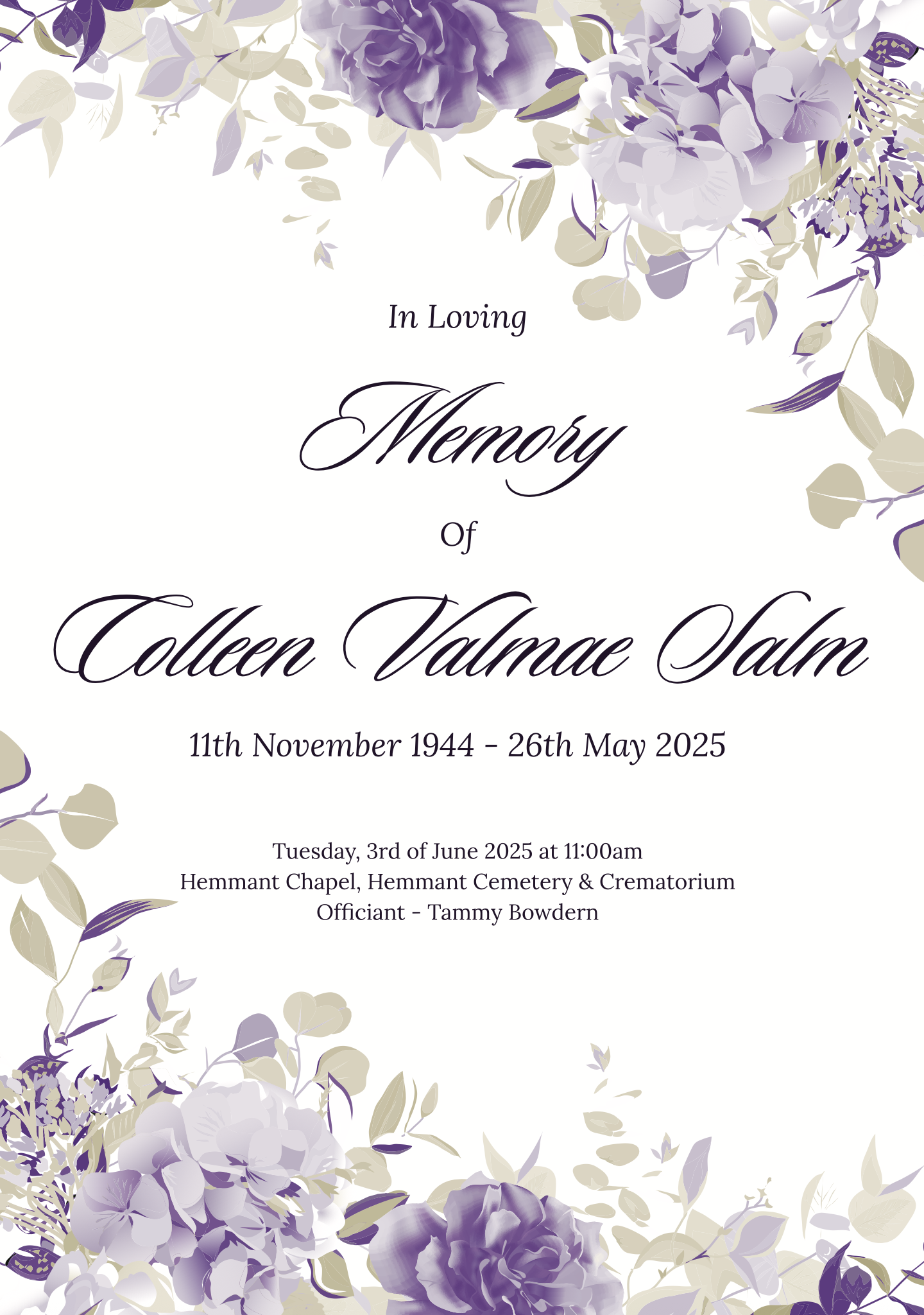 Family and friends are invited to attend a celebration of life for Colleen, to be held on Tuesday, 3rd June 2025 in the Chapel at the Hemmant Cemetery and Crematorium, 500 Hemmant Tingalpa Rd, Hemmant commencing at 11:00am.