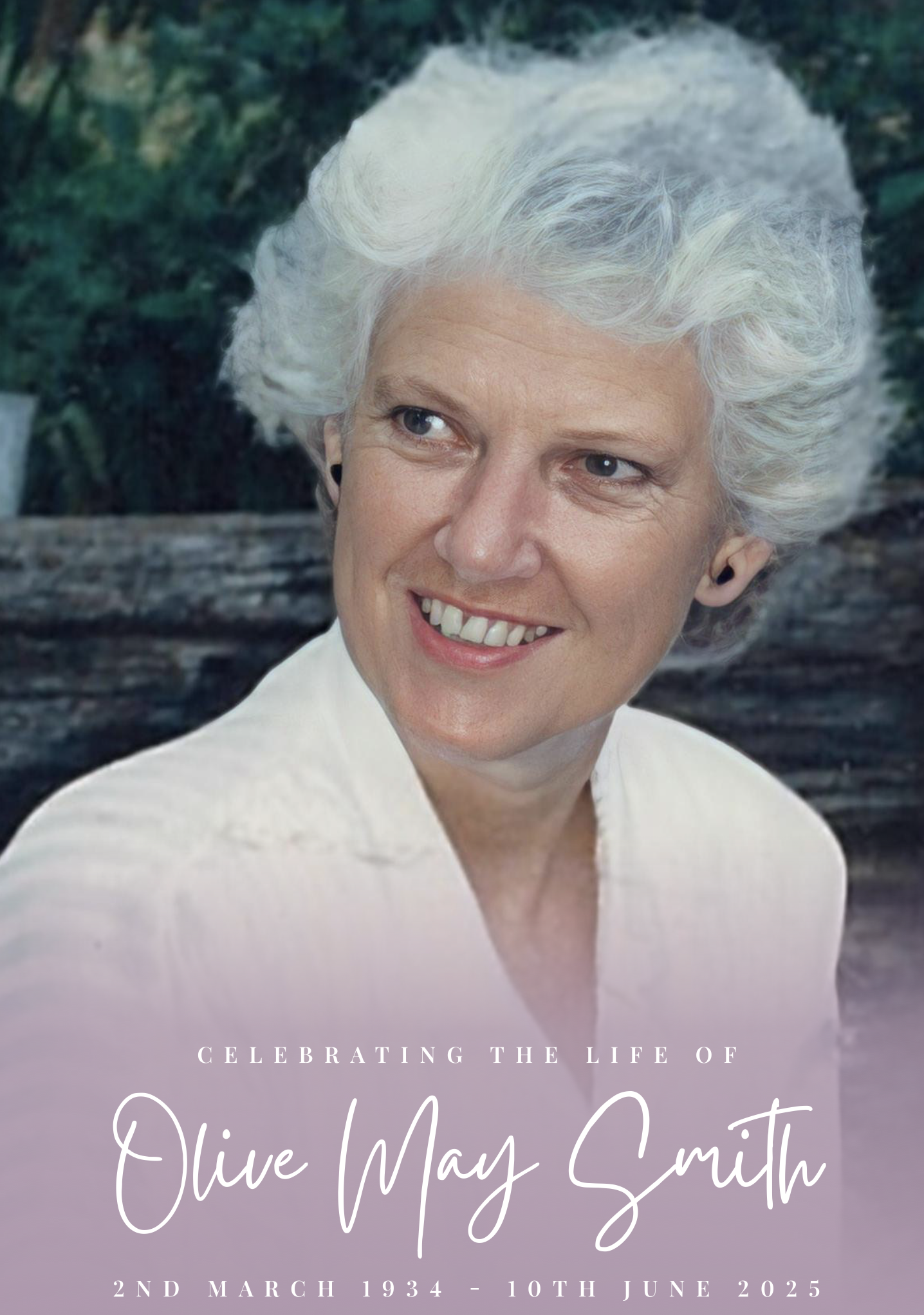 Family and friends are invited to attend a celebration of life for Olive, to be held on Thursday, 10th July 2025 in the Garden Chapel at the Great Southern Memorial Park, 1774-1974 Mount Cotton Road, Carbrook, commencing at 12:30pm.