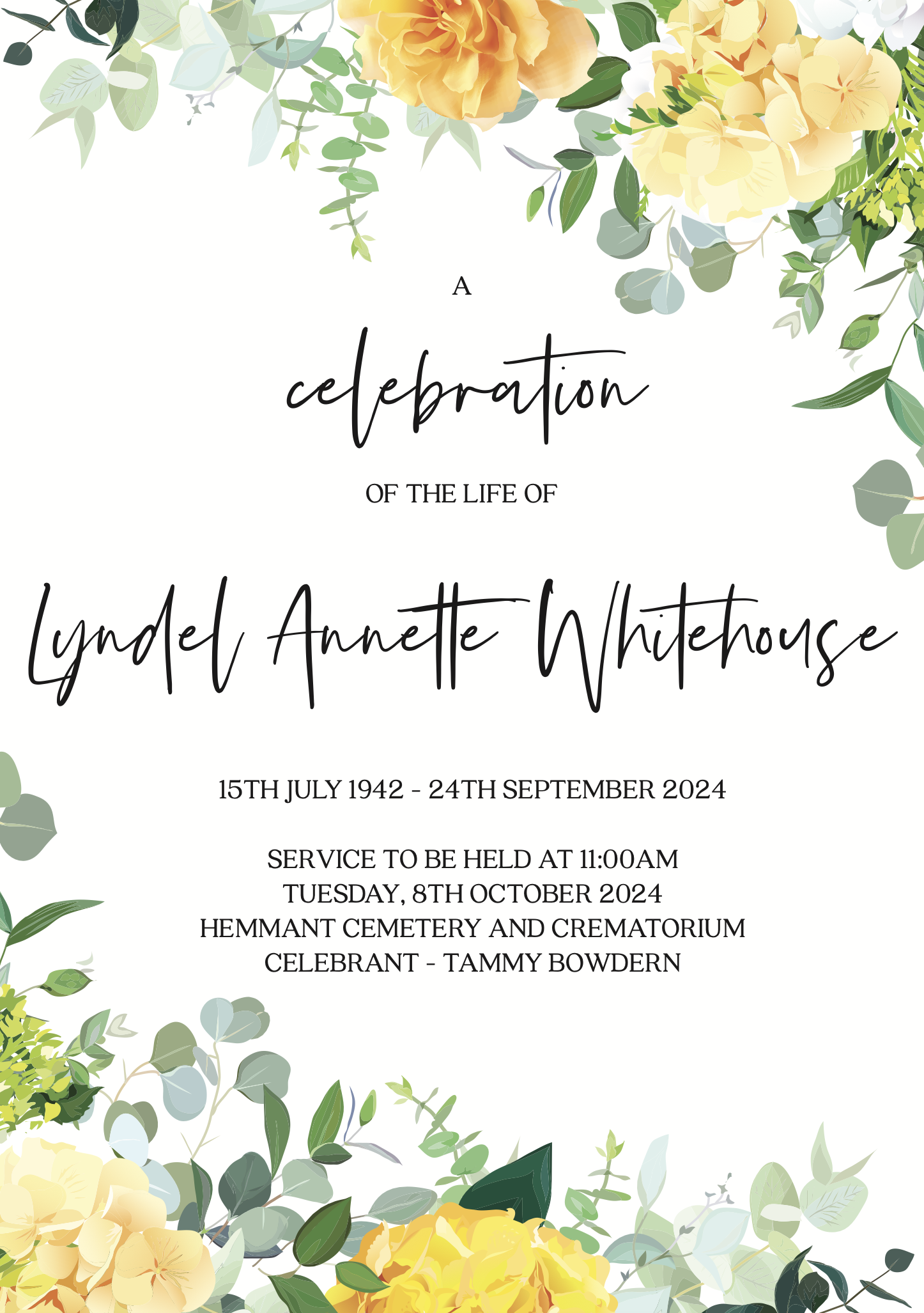 Family and friends are invited to attend a celebration of life for Lyndel, to be held on Tuesday 8th October 2024 in the Chapel at the Hemmant Cemetery and Crematorium, 500 Hemmant Tingalpa Rd, Hemmant, commencing at 11:00am.