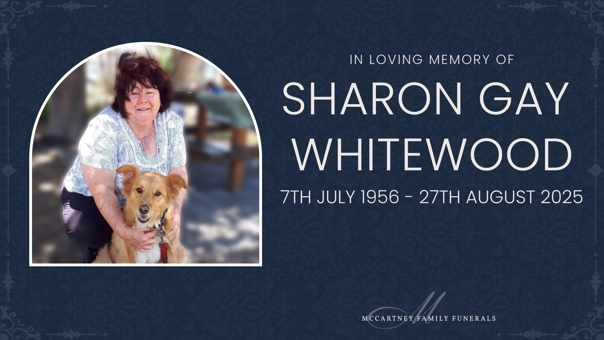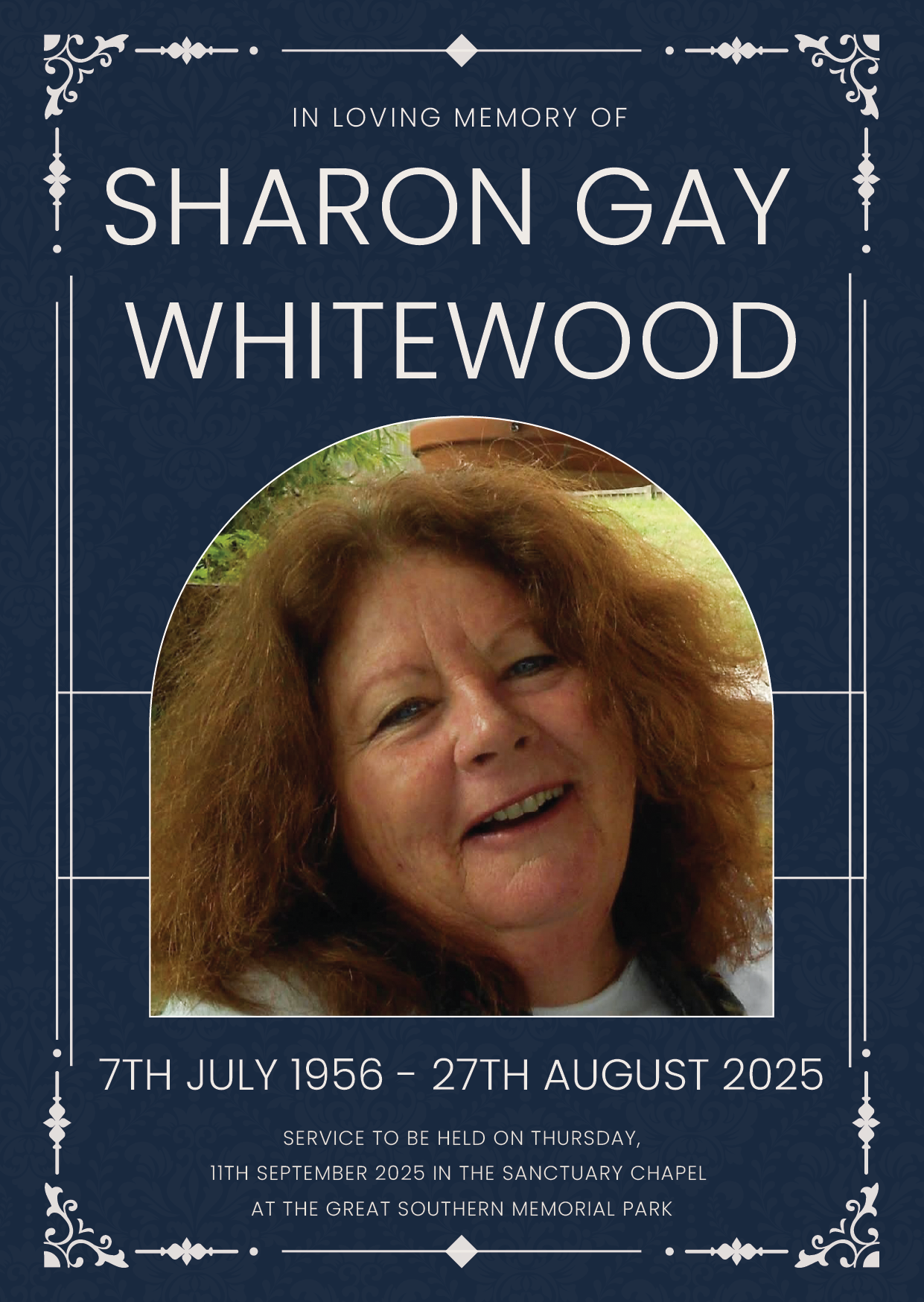 Family and friends are invited to attend a celebration of life for Sharon, to be held on Thursday, 11th September 2025 in the Outdoor Chapel at the Great Southern Memorial Park, 1774 Mt Cotton Road, Carbrook, commencing at 11:00am.